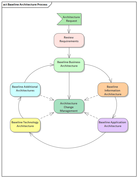 Baseline Architectures are often difficult to justify to executive and management level stakeholders who have a greater appetite for target architecture and roadmaps. The importance of the baseline architectures is to establish the starting point that will allow transitions to the target architectures to be defined. It is often the case that documentation and models will exist that can be mined to collect material to populate the baseline repository. For example most organizations have had at least a couple of attempts at modeling the existing processes perhaps as part of a business re-engineering effort and one or more information models and hardware diagrams will often exist.