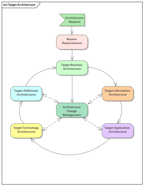 An architecture process or method is required to prescribe the way architectures should be developed. Not all frameworks provide a defined process and leave it up to an organization to create and configure their own process. Enterprise Architect can be used to define a process at any level of detail and using the drill-down to child diagram feature more granular aspects of the process can be elaborated. UML Activity diagrams can be used to create a suite of diagrams that express the process of architecture creation including the processes, the tasks, the inputs and outputs and the people that perform the various steps in the process. Enterprise Architect also has an extension called the Software Process Engineering Metamodel (SPEM) that can be used to define the process with great rigor if required. In most cases the UML Activity diagram will be sufficient to create a detailed process.