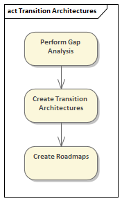 Transition Architectures are the stepping stones from a baseline architecture to a final target architecture and are theoretically target architectures themselves. They represent the practical steps from a current state to some aspired to future state and will often be represented as projects or phases in a project at an implementation level.