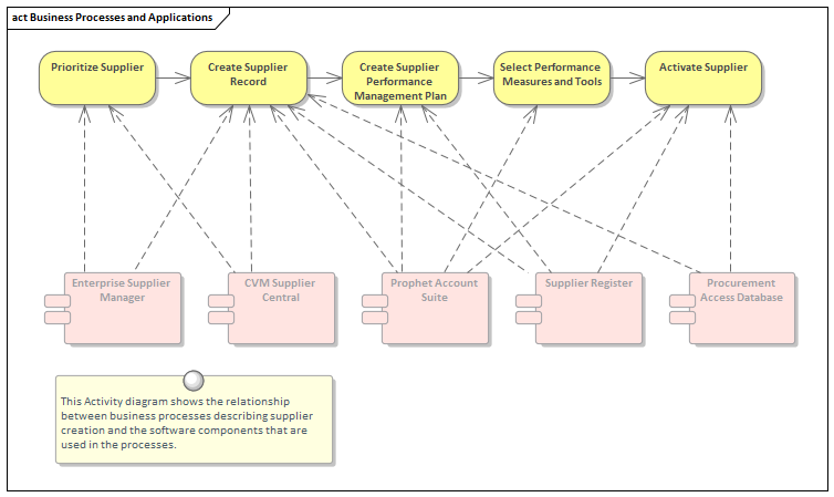 An architecture can provide profound insights into the relationship between the business processes that model how an organization carries out its work, and the application components that assist them. Enterprise Architect can be used to create expressive visualizations of these connections, which are particularly useful when analyzing current state models. Organizations have typically been formed through a diverse set of changes and developments, resulting in a complex set of processes and an equally complex set of applications that interact together. This often leads to redundancy, duplication and inefficiencies that cannot be seen unless an architecture is constructed to visualize the connections and to highlight the issues.