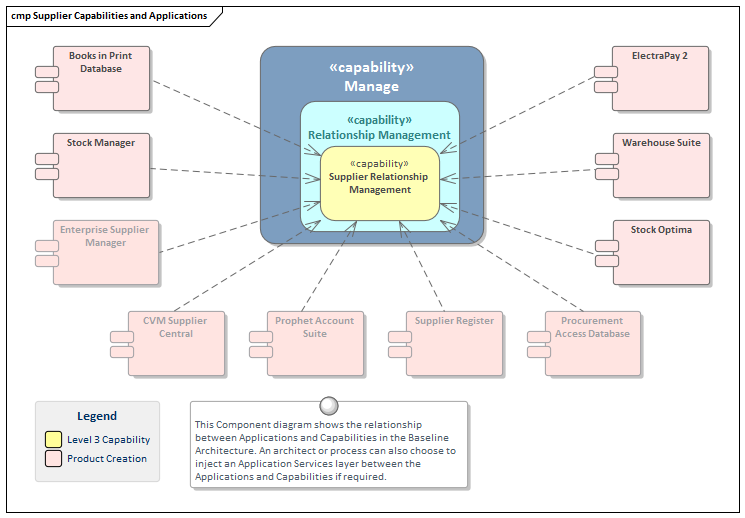 Enterprise Architect can also be used to define the baseline architecture by describing the existing applications that deliver a capability or to define a target state by prescribing the planned applications that will deliver the capability. Regardless of the purpose of the architecture the capabilities provide a sound and business driven anchor point for the applications.