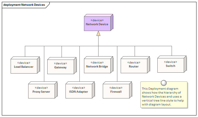 The Technology elements section of the TRM is a hierarchical structure and classifies parts of the infrastructure based on their function as a Physical or Virtual Node, Device or Execution Environment. This allows any type of technology concept, physical or virtual to be modeled including a wide range of infrastructure pieces such as servers, routers, operating systems, hypervisors, database management systems, web servers and more.