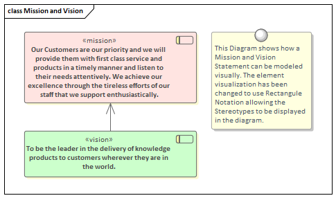 Enterprise Architect allows both the mission and the vision statements to be modeled using the UML Extension mechanism of stereotypes, and these statements can be included in diagrams and related to other elements such as Goals and, in turn, to Objectives. These diagrams are compelling for senior executives and line managers, who can see clearly that the architecture work and the subsequent implementation initiatives can be traced back to the strategic primitives.