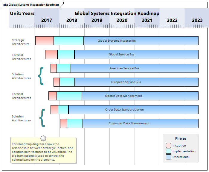 The flexibility of the overlay allows any diagram to be converted into a Roadmap, and there is a wide range of settings that can be used to configure the visualization of the Roadmap, including the Diagram Legend, which can be used to define the segmentation of the elements into a series of phases. The Roadmap Options can be used to change the time scale from years, quarters, months, or days down to a very fine graduations (used for engineering diagrams). The start and finish times can be set and the scale can be changed to stretch or collapse the time scale. The position and height of the time ruler can be changed and fonts and colors can all be configured to make the diagrams more appealing.