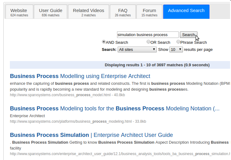 The tool also provides an Advanced Search feature which allows a user flexibility to search conditionally using logical OR and AND including a Phrase search and the facility to specify which sources to use for the results. In this example a user is wanting information about Simulation in the context of a Business Process and so uses the AND option to search for results.