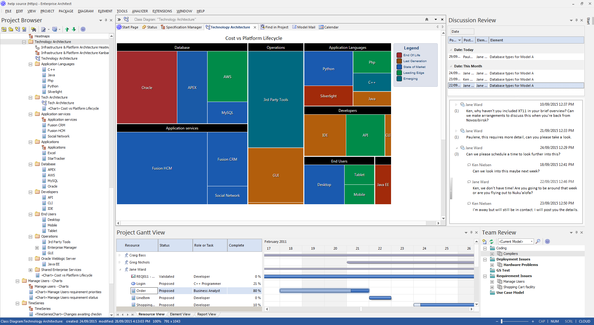 In addition to the extensive range of template driven reports available, Enterprise Architect also includes comprehensive support for building management level charts and dashboards that integrate tightly with model content. Series charts, pie graphs, heat maps and others make it possible to build a high level summary of the state of the current model (and of other models using custom connections).