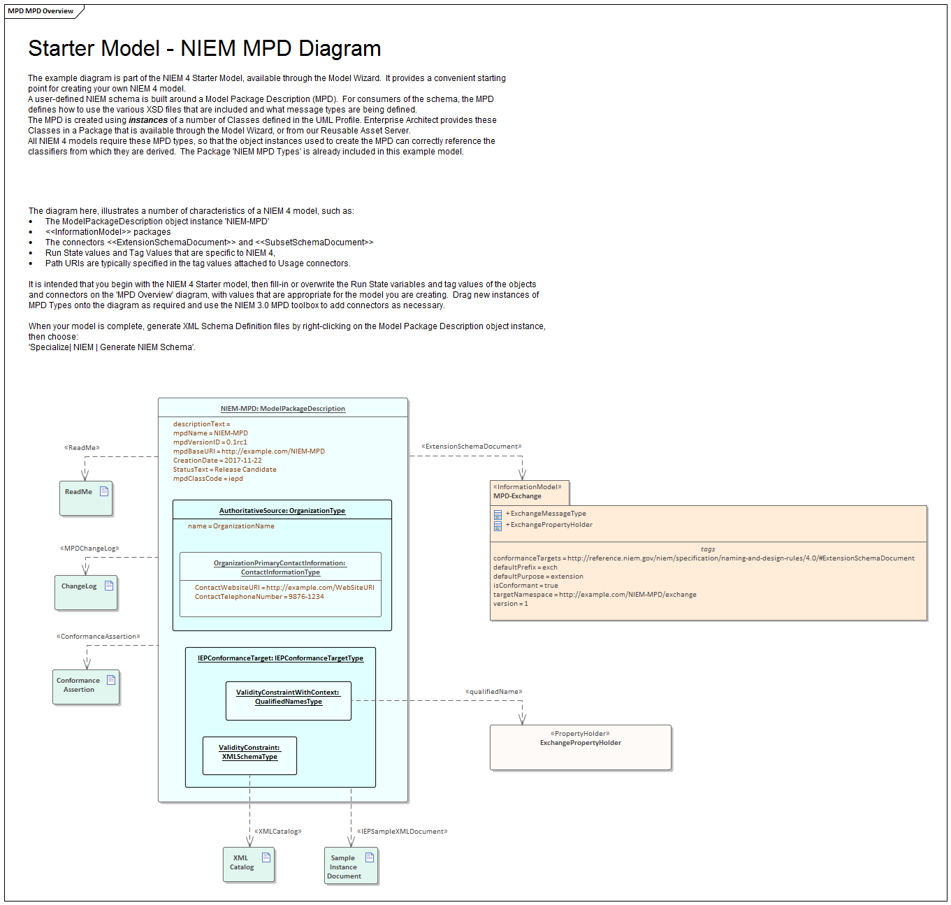 - ALL projects containing NIEM models must include the NIEM MPD Types Package downloaded via the Model Wizard; the ModelPackageDescription instance is central to your NIEM model
