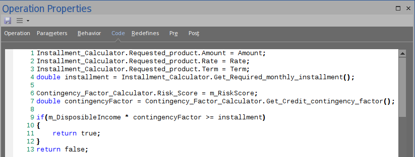 Suppose we have a Class Applicant with an operation AffordabilityForProduct that evaluates whether the applicant can afford a loan product.