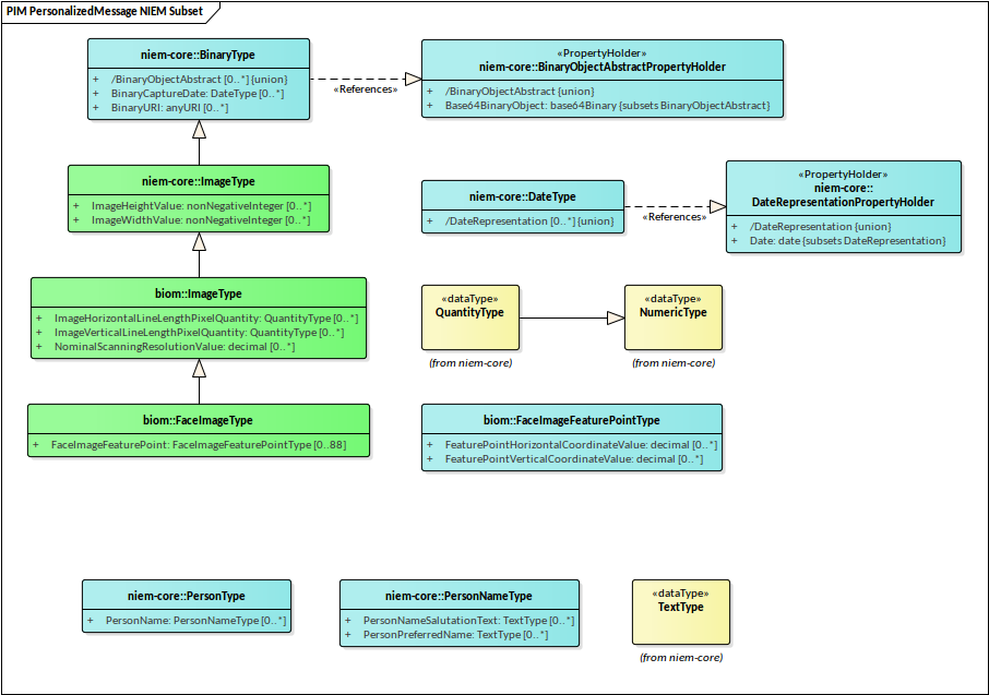 Our request message specifies that it will send a facial image to be used for facial recognition. To do that, we need to subset the appropriate types from the Biometrics Package. Start by locating the type FaceImageType in the Domains\Biom Package within the NIEM 4.0 Reference Model. Drag this type into the Schema Composer. The super types from which this type inherits are automatically added to the Schema Composer.