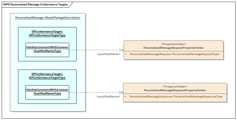 When describing the MPD earlier, we referred to a PropertyHolder that contained the possible document roots for our two messages. Now that we have defined our subset Packages we can define these document roots. Because we are only creating two simple document types, all that is needed is a PropertyHolder and ObjectType for each message. The ObjectTypes link to the types we've selected from the NIEM framework, to describe the contents of each message as shown: