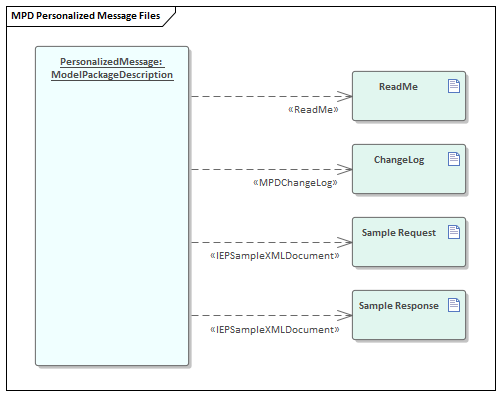 All IEPD Packages are expected by NIEM to contain - at a minimum - a change log and a readme, but there are several other types of artifact that are also supported. In Enterprise Architect, each is defined using a stereotyped relationship to an Artifact. As with the Package use, the relationship specifies where the file will be located. In this image a ReadMe, ChangeLog and a sample document for each of the document types are described. This will add information about those files to the target catalog file. The files will not be created by Enterprise Architect, and their content is beyond the scope of this tutorial.