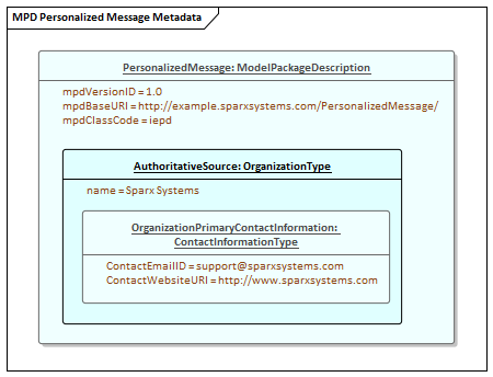 Previously, the framework Packages that are required for NIEM modeling were described. The Model Wizard also provides a Package that acts as a convenient starting point for defining your MPD. When this is imported to your model you will find a diagram containing instances of the MPD types, with the run-state set to show the core properties that you are most likely to need to set.