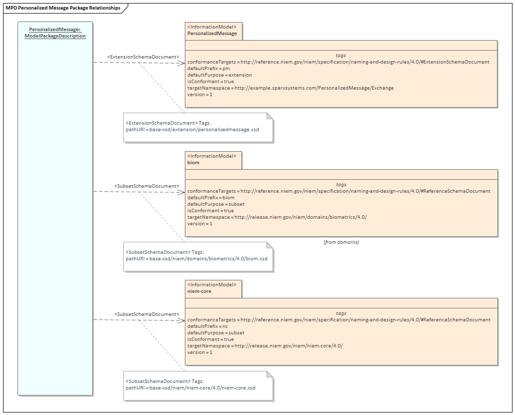 The relationships connecting the Model Package Description to the Information Models specify which schema files are to be generated with this MPD. In this example we will use types from two different NIEM namespaces. To do this, we first create an InformationModel Package for each, where the Namespace Tagged Values match the original, and the purpose is set to subset. We will also need an extension Package where we can define our own types and how the NIEM types will be used. This figure shows how this will look: