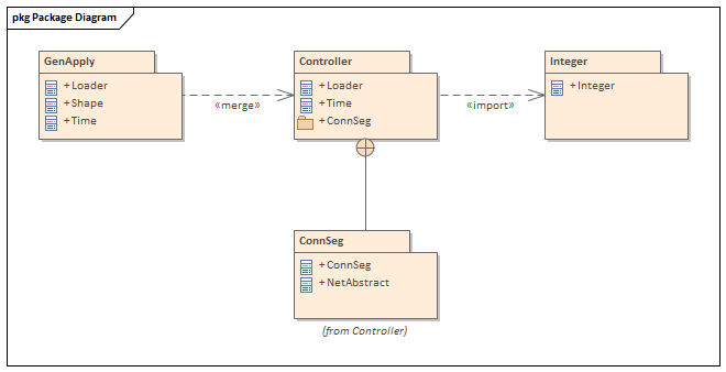 In a Package diagram, a Package Merge indicates a relationship between two Packages whereby the contents of the target Package have been merged with those of the source Package. In the example diagram, the «merge» connector indicates that the Controller Package's elements have been imported into GenApply, including Controller's nested and imported contents. If an element already exists within GenApply, such as Loader and Time, these elements' definitions are expanded by those included in the Package Controller. All elements added or updated by the merge are noted by a generalization relationship back to that Package. |