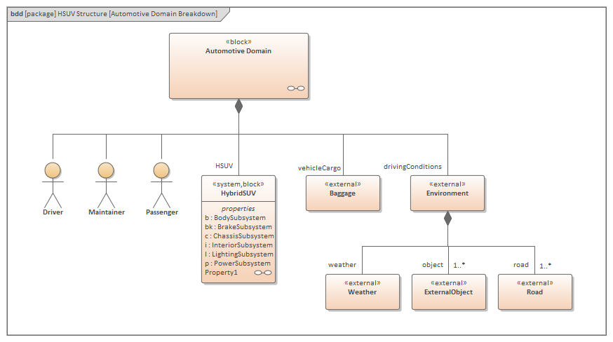 This example SysML Block diagram can be found in the EA Example model under Systems Engineering > SysML 1.5 Example: HSUV > Modeling Domain > HSUV Model > HSUV Structure.