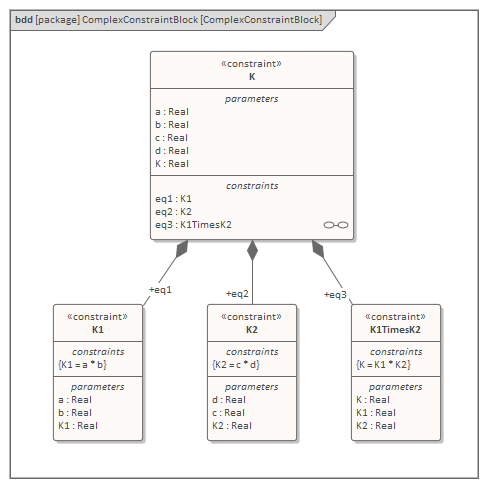 In this example, the Constraint Block K does not itself define any constraints, but as a composite inherits them from its three component Constraint Blocks K1, K2 and K1TimesK2. Constraint Block K inherits the five parameters a, b, c, d and K.