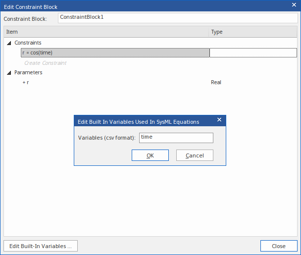 For example, OpenModelica defines 'time' as a built-in variable, so we would add 'time' to the list for the Constraint Blocks. Then when we enter the equation 'r = cos(time)' only the parameter 'r' will be extracted.