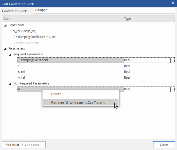 We can delete 'd' and create 'dampingCoefficient', as explained earlier; however, there might be binding connectors connecting to parameter 'd' and all we want is to rename parameter 'd' to 'dampingCoefficient'. Therefore, a better solution is to right-click on the 'Not Required' parameter 'd' and choose the menu option Rename 'd' to 'dampingCoefficient'.