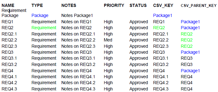 If you intend to import hierarchical information from a spreadsheet that was not populated by exporting data from Enterprise Architect, you must add these two fields to your spreadsheet as the last two columns, and populate the columns yourself. For example: