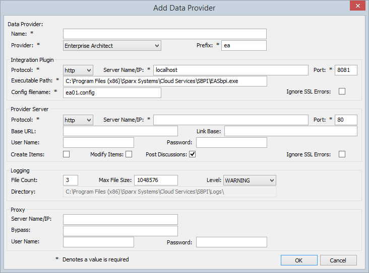 Wherever possible the 'Add/Edit Data Provider' screen will fill each field with a default value in order to make it easier for you; if the default values are not correct, simply overwrite them. To this end, whenever the 'Provider' value is changed, a number of other fields will be set to the default values for the new Provider, such as the Data Provider's Prefix, the Integration Plugins' Executable Path and config filename, as shown here when Enterprise Architect is selected: