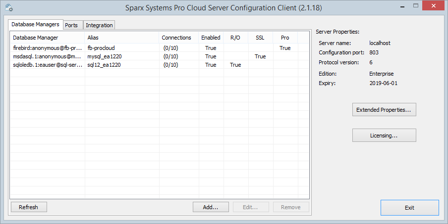This panel lists the defined repositories that the Cloud Service managers. Each database manager definition contains the details of one database connection and a number of other properties that control how the database connection will be managed. The most important of these properties are displayed as columns in this list: Columns Database Manager - the database connection string of the repository Alias - a unique name that identifies the repository. On Enterprise Architect's 'Cloud Connection' screen this is the value entered into the 'Model Name' field. An alias can be assigned when a database manager is defined, if this field is left blank the Cloud Service will determine its value. Connections - the number of active user connections and the maximum number of connections possible. Note: typically the number of active user connections is zero, since they are only considered 'active' while a request is being processed, as soon as the data is returned to the client the connection is set to inactive. The number of connections is only refreshed when either the is pressed or a change is made to a database manager's definition. Enabled - a flag to indicate if the database manager accepts requests from clients R/O - a flag to indicate if the database manager has been configured as Read-Only SSL - a flag to indicate if the database manager has been configured to only allow secure connections Pro - a flag to indicates if 'Pro features' has been enabled for the repository, this is controlled by the 'Enable Pro Features (OSLC, WebEA and Integration)' option on the Configure Database Manager screen. |