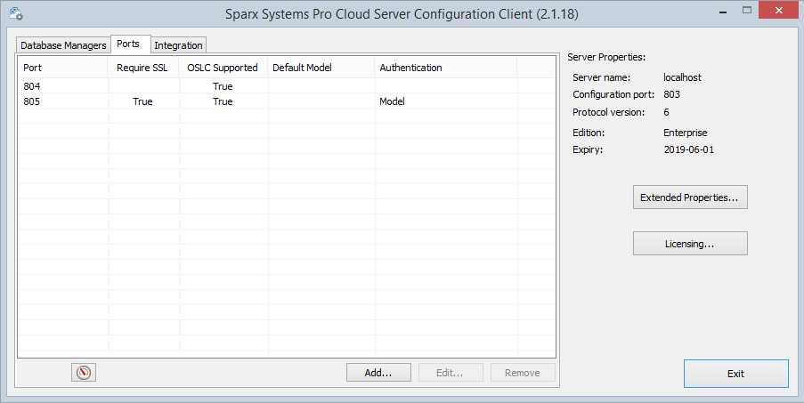 The main area of the Ports tab provides a list of the existing Port definitions. These Port settings are also covered in more detail in the Add a Port topic. Columns Port - The Port Number Require SSL - When True, models can only be accessed on this port via the HTTPS protocol OSLC Supported - Displays True if OSLC support is enabled for this port. OSLC Support is required for WebEA access. Default Model - If the port is configured to open a specific default model, it's name is displayed Authentication - Indicates what type of Authentication is required (if any). |