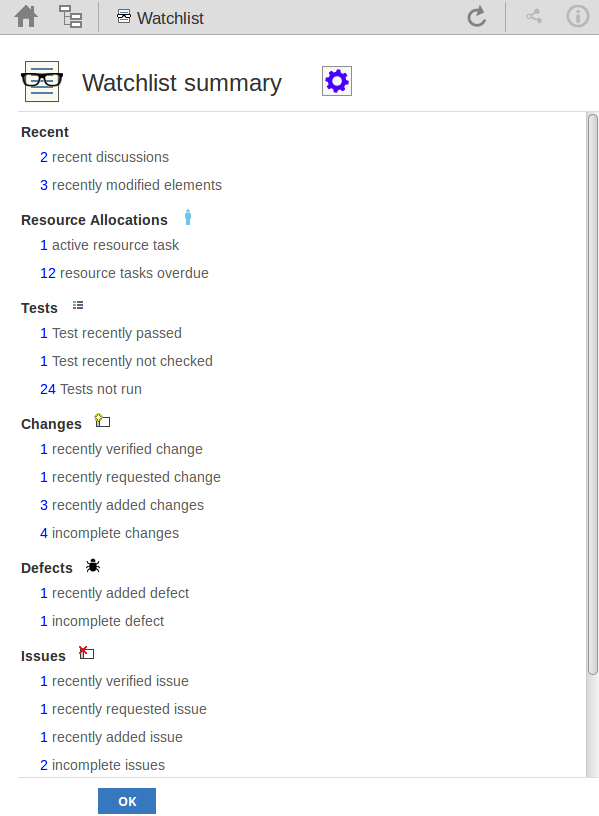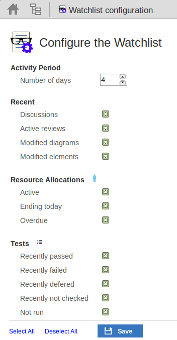 The Watch List facility in WebEA helps you to quickly identify recent activity in the model. Each user can tailor their Watch List to monitor activity in any of a wide range of objects and features with various characteristics. Whenever the Watch List Summary is generated, all object types of interested are checked for recent activity and a count of matched objects displayed. All matched object counts can be clicked on to display the list of objects that match the particular activity type.