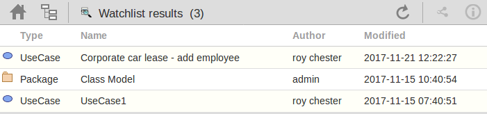 The watch list results page is the same as the custom search results page, in that if you then click or tap on an individual item in the list, the 'Properties' view will be displayed for the selected object. See the WebEA's Layout Help topic.
