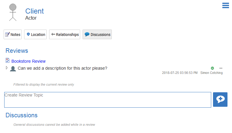 When you have opened and read through the contents of a Review element, you can add your own review topics or respond to existing points. To do this you click on the name of the object you want to comment on, then select the 'Discussions' feature button.