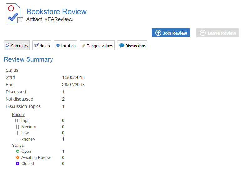 When the properties of a Review element are loaded in WebEA's Main View, the default feature which is displayed is a Summary of the Review. This includes the status, start and end dates, number of elements discussed and yet to be discussed, and a break down of review topics based on priority and status, as illustrated here: