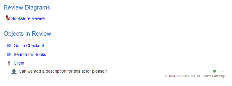 The 'Review Diagrams' section provides links to the diagram which are associated with the review (I.e. those which are children of the Review Element).