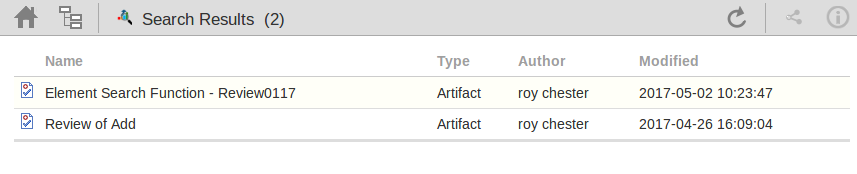 To check on recent Review elements available in the model, click on the 'Search' icon in the WebEA header and select the 'Reviews' option. This conducts a search for recent Review elements and lists them in the 'Search Results' view, with the most recently changed element at the top of the list.