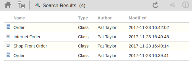 The results provide the object name, type, author and last-modified date of each object that matches the search criteria. If you click on an item, the 'Properties' view will be loaded for that object.