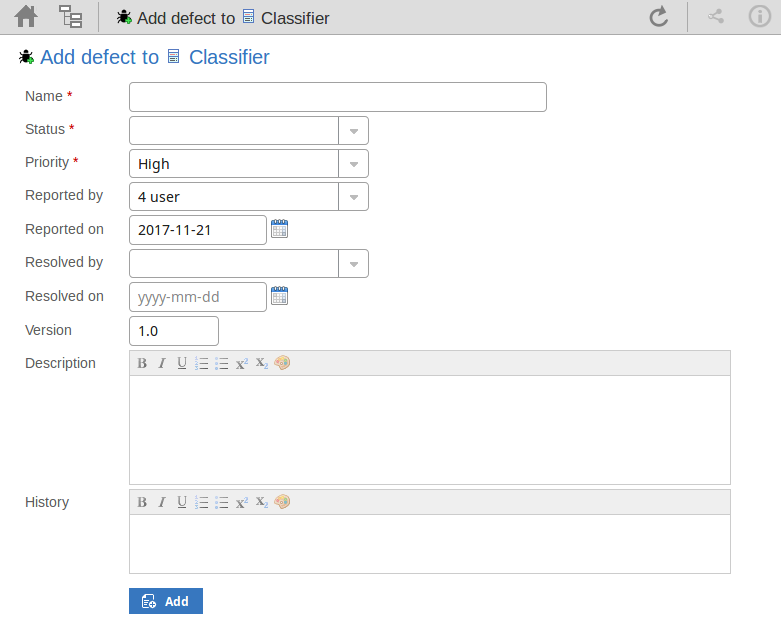 Type in a version number or letter to indicate any evolution of the same defect. Generally, '1.0' indicates the first instance of a defect. |