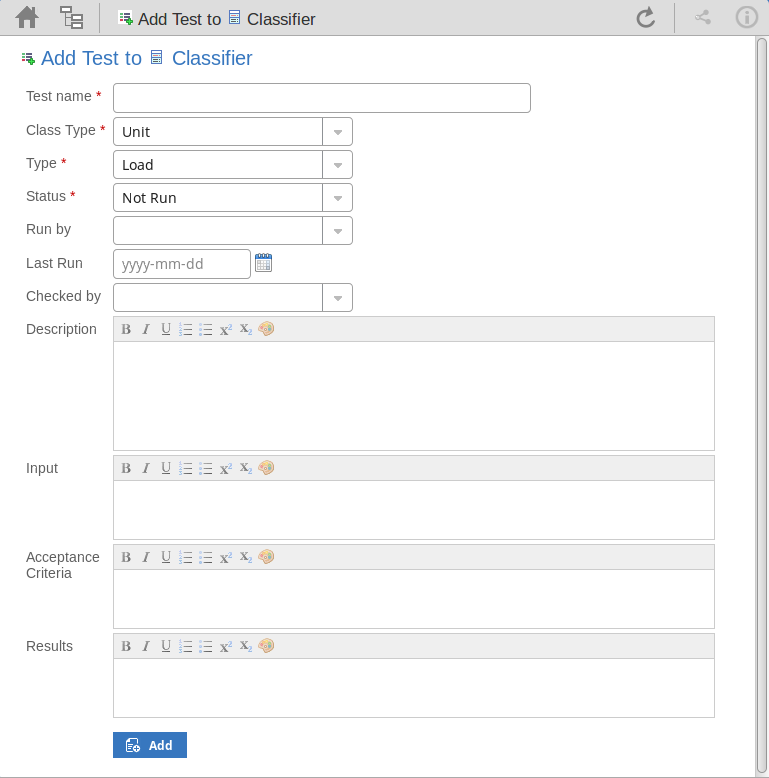 Click on this button to submit the details and create the Test record on the selected element. This message is displayed: Test <name> was successfully added to <element name>. Either: