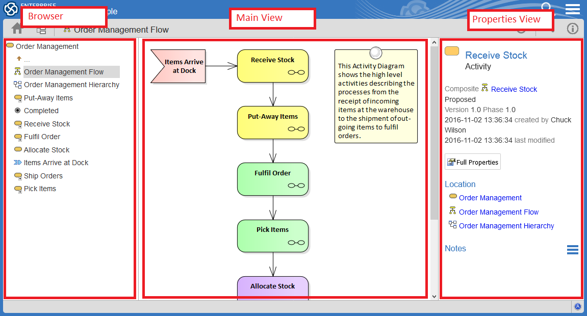- Optionally, the Properties View on the right. This allows you to view properties of an element while simultaneously viewing something else (such as a diagram) in the main view.