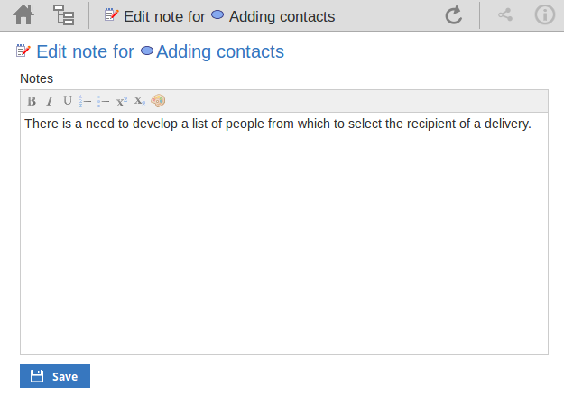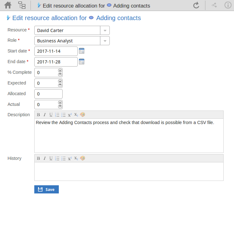 If necessary, edit the description of the resource allocation, perhaps to explain the changes you have made to earlier fields. You can format this text using the facilities provided in the Notes toolbar, as explained in the Edit Notes section. Before changing the text, you might want to copy it to paste into the 'History' field for editing there. |