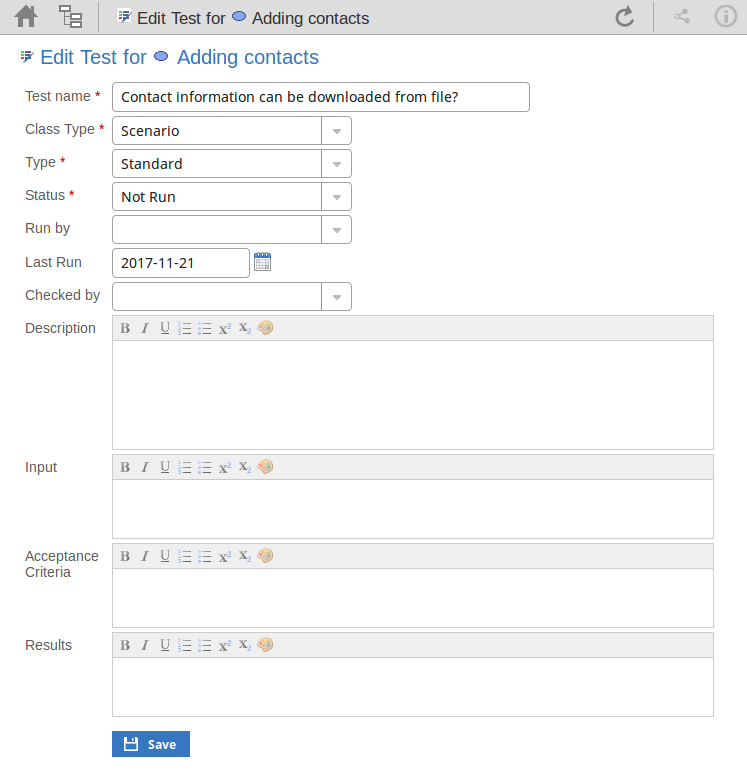 The tests assigned to an element support a range of situations including user acceptance and scenario. You could be asked to define or perform tests on parts of a model of relevance to you as a customer or user, or you might want to add information obtained from other people you have asked to perform an evaluation. Therefore, you might need to edit test records to update them with your information.