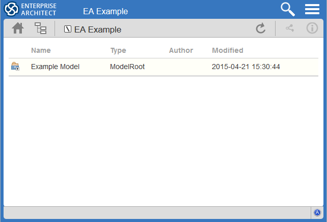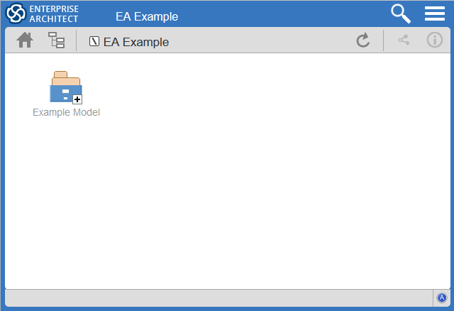 WebEA's heading area displays the application logo in the top right corner, the name of the currently opened model, a search icon and a 'hamburger' icon. The search and 'hamburger' icons contain further options that are accessible when selected.