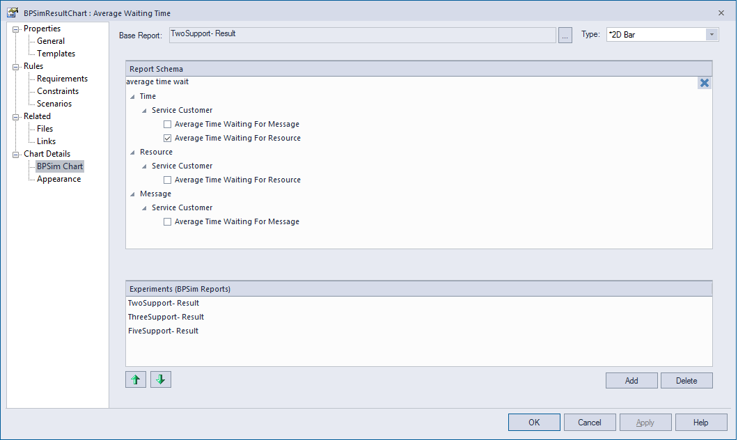 - Time | Service Customer | Average Time Waiting For Resource - Click on the to add another two BPSim Reports: 'ThreeSupport-Result' and 'FiveSupport-Result'.