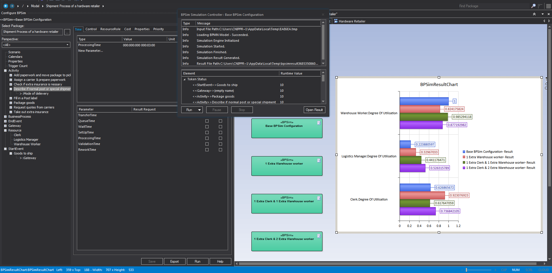 The open BPSim specification provides a rich set of material on how to configure and assign resources to activities/tasks, how to raise events, decision making and other real-world capabilities. Once configured according to the BPSim specification, a business process model (constructed in BPMN) can be sent to a suitable BPSim simulation engine and run according to the process defined in the BPMN model, using the configuration data attached in the BPSim information.