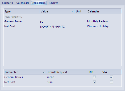 This tab is used for defining global properties; that is, properties of the scenario, or properties that have even broader application, such as 'Number of Issues' or 'Net Cost'.
