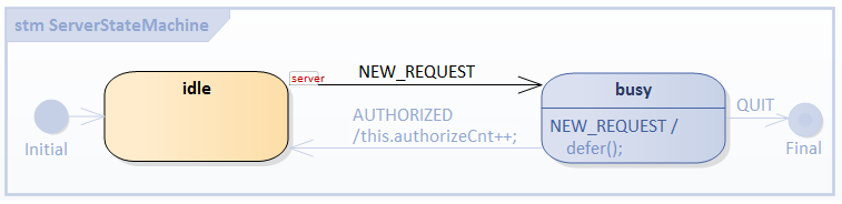 - Back to idle, with the trigger AUTHORIZED, with the effect "this.authorizeCnt++;"