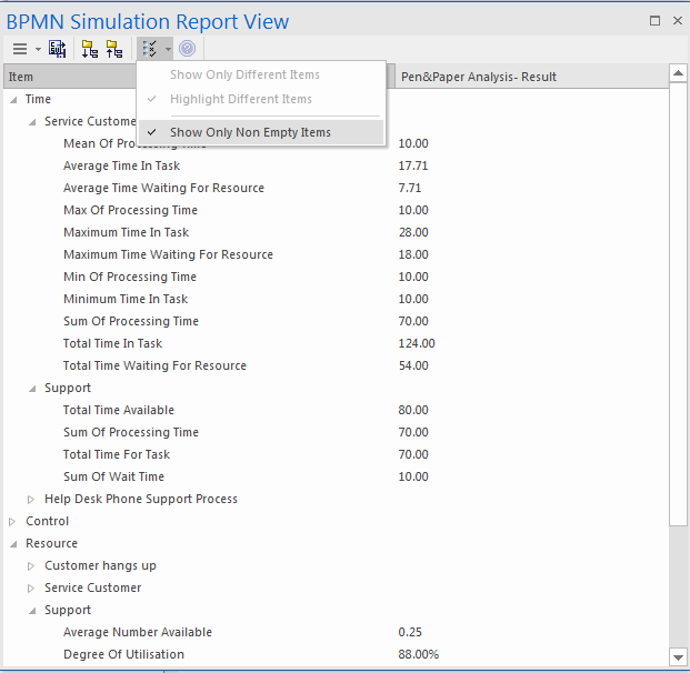 - The two Support resources - are they busy? If they were not, we might have to change the process to use all of their time and reduce the customer's waiting time; however, the 'Degree Of Utilisation' is at 98%, which indicates that the resources had almost no idle time