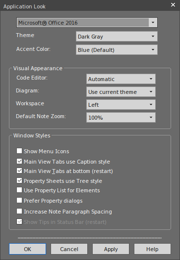 The illustrations of the user interface you have seen in the guide have a particular color and appearance - or visual style. You can change this style to one of several alternatives, using the 'Application Look' dialog (select the 'Start > View > Visual Style > Visual Style' ribbon option).