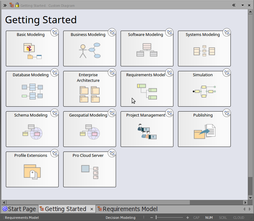 When you load the EAExample model, its default diagram 'Getting Started' is loaded. The 'Getting Started' diagram contains a series of links to other diagrams that relate to different modeling domains, such as Business Modeling or Systems Modeling, as well as some of the tasks you might want to perform in Enterprise Architect, such as Project Management and Publishing. Double-clicking on a diagram link will open the diagram. The next level of diagrams typically contain a description and some instructions on how to access related features in Enterprise Architect, and further links to model examples for that area of interest.