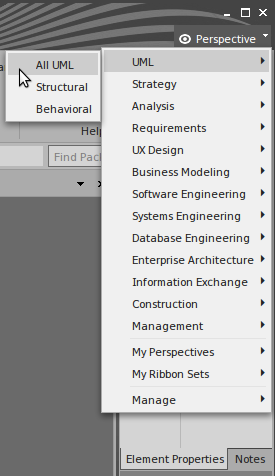 Perspectives refine the model development facilities in Enterprise Architect to support a particular technology or domain, The most visible effects of setting a Perspective are that the contents of the Diagram Toolbox are restricted to those element and connector sets used in the domain, and the model Patterns are tailored to generate diagram and/or model structures of exactly the type for modeling in your selected area.