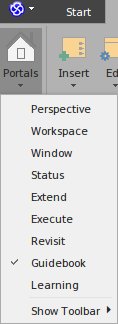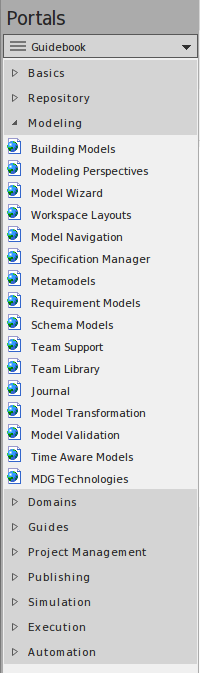 The Portals Window displays one of nine Portals, and provides the facility for switching to a different Portal. The Portals identify tasks in particular areas of work, and provide links to the window or dialog for performing each task. The Guidebook and Learning Portals provide links to online information that describes a feature of Enterprise Architect and how to work with it. You display the Portals window by selecting the 'Show > Portals' option at the left end of the ribbon bar.