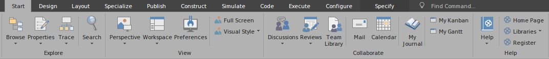 Ribbons, shown at the top of the work area, provide access to almost every tool and facility in Enterprise Architect. Each ribbon supports a domain of work - such as designing the model components and structure - and is divided into segments to group the tools and facilities according to the structure or function the tools support.