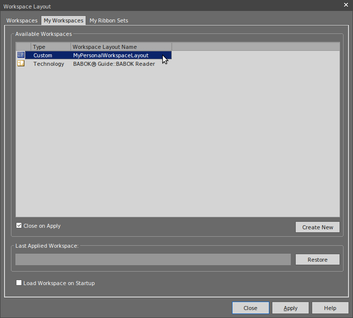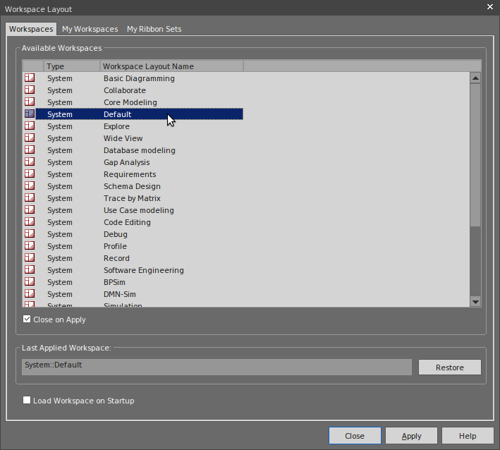 The ribbons at the top of the work area together provide access to almost every tool and facility of Enterprise Architect, but as you are unlikely to use every tool and facility you might consider tailoring the ribbons to exclude things you do not need. You first display the 'My Ribbon Sets' tab of the 'Workspace Layout' dialog (select the 'Start > View > Workspace > My Workspaces' ribbon option and click on the 'My Ribbon Sets' tab).
